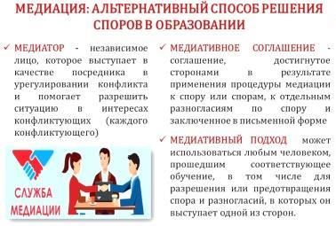Службы медиации – сделать так, чтобы максимальное число конфликтов разрешалось восстановительным способом. Восстановительный подход к разрешению конфликтов позволяет избавиться от обиды, ненависти и других негативных переживаний, самостоятельно разрешить ситуацию (возместить ущерб, договориться, извиниться, простить), избежать повторения подобного в будущем.