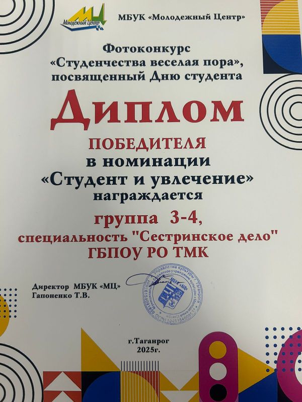 Студенты ГБПОУ РО «ТМК» специальности «Сестринское дело» гр. 3-4 и специальности «Фармация» гр.1Ф1 приняли участие в фотоконкурсе «Студенчества веселая пора», который был организован Молодежным Центром города Таганрога и посвящен Дню российского студенчества.