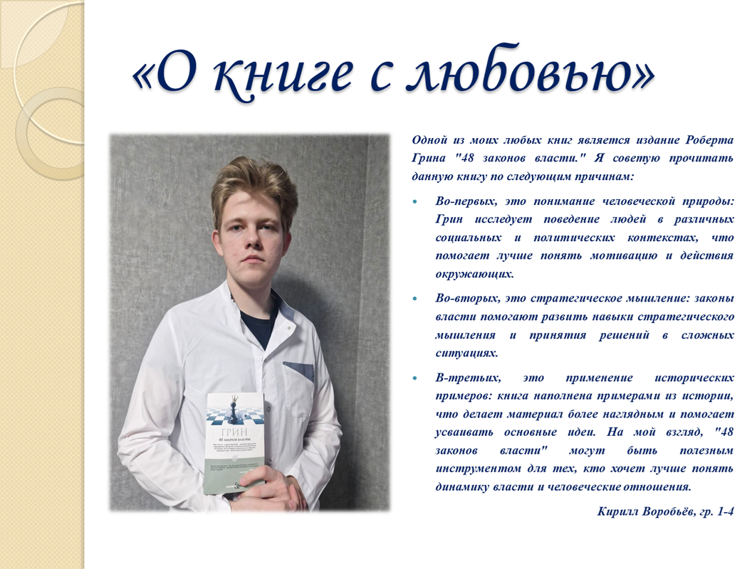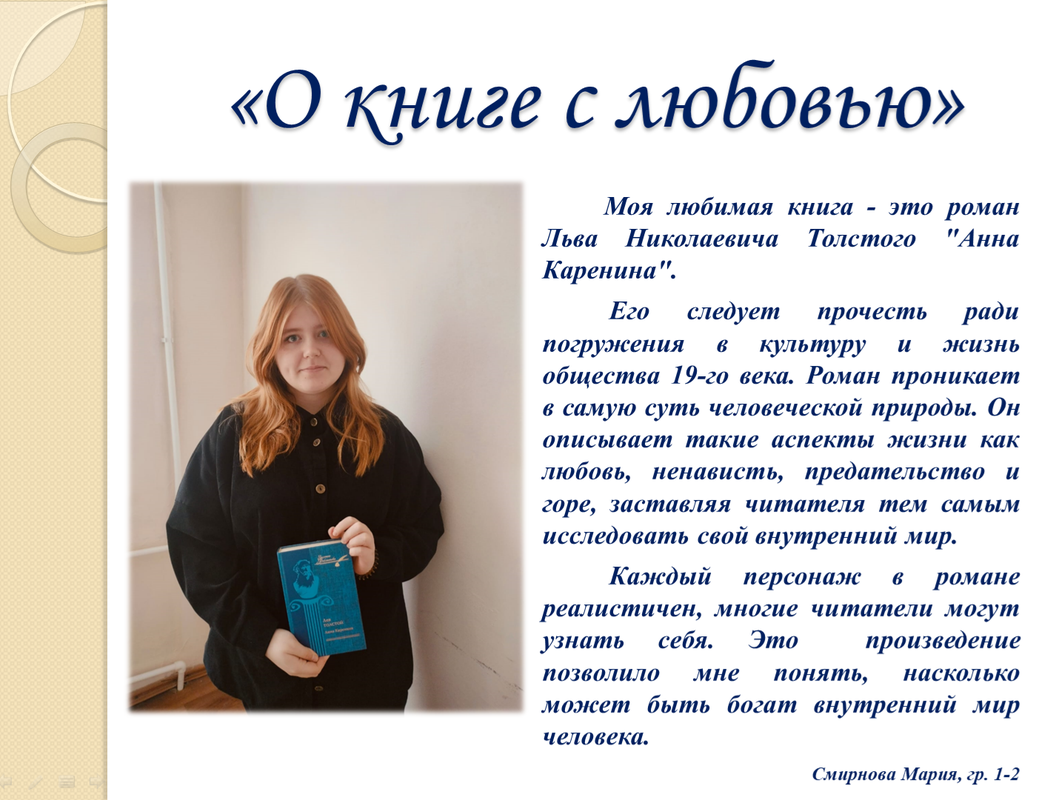 Ко Дню единых действий студентами первого курса специальности «Сестринское дело» организована акция, в рамках которой они делятся своими любимыми произведениями и рассказывают, почему эта книга так ценна для них. Цель акции: воспитывать понимание художественной культуры как средства коммуникации и самовыражения в современном обществе, значения нравственных норм, ценностей, традиций в искусстве.