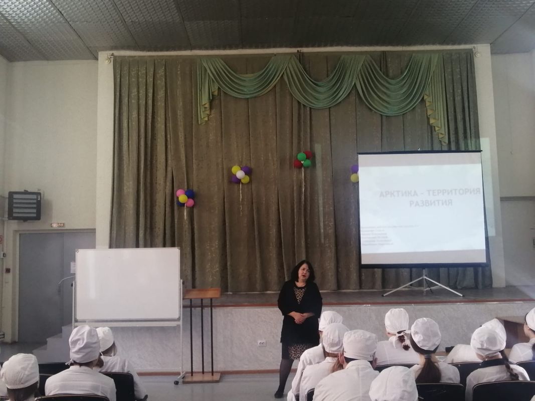 В ходе занятия студенты узнали об истории исследования и освоения Арктики - стратегически значимой территории и ресурсной базы России; просмотрели иллюстрирующие тему видео. Актив группы 1-1 (куратор Католикова О.С.) подготовил сообщения о развитии важнейшей транспортной магистрали региона – Северного морского пути, освоение которого возможно благодаря атомному ледокольному флоту, который есть только в нашей стране.