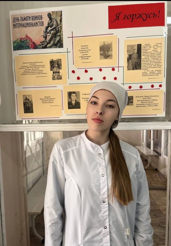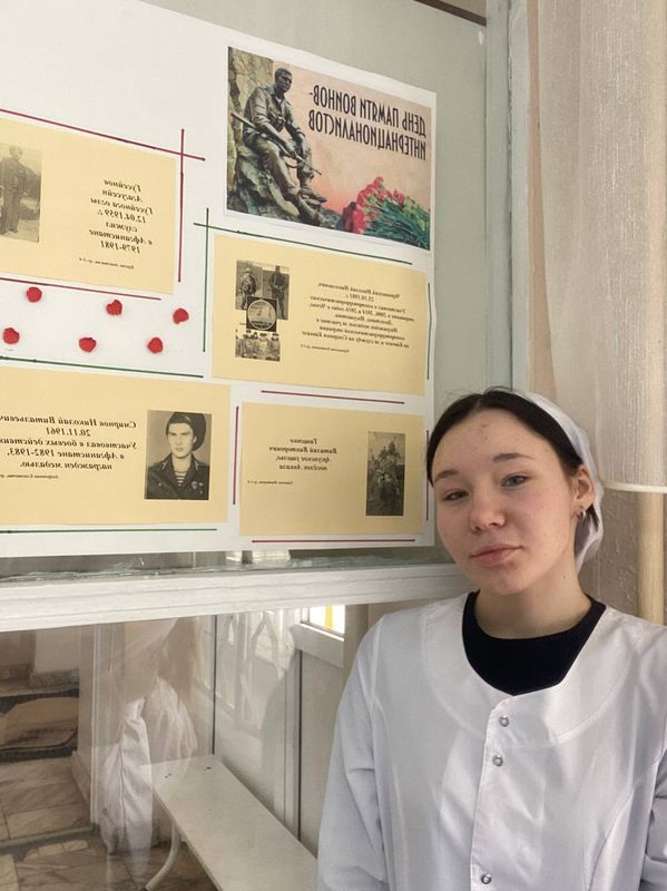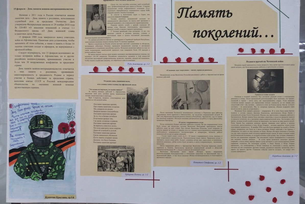 С целью развития базовых национальных ценностей, таких как жизнь, достоинство, патриотизм, гражданственность, служение Отечеству и ответственность за его судьбу, историческая память и преемственность поколений в ГБПОУ РО «ТМК» проходит акция «Я горжусь», в рамках которой участники могут рассказать о своих родных, близких или знакомых, которые защищали или защищают нашу Родину. В Центре студенческих инициатив оформлен информационный стенд, на котором представлена информация о военных действиях в Афганистане, самоотверженном труде медиков, фотоархивы и биографические справки.
