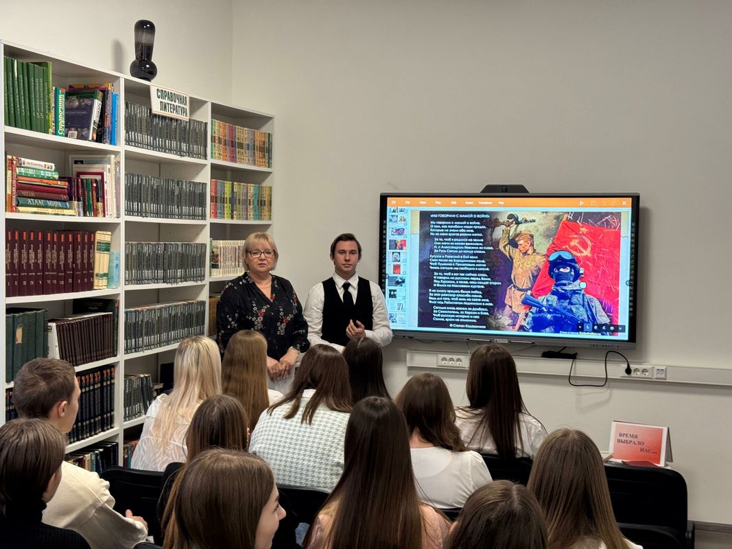В ходе встречи студенты познакомились с современными поэтами и их произведениями, с книгой Захара Прилепина «Жизнь за други своя. Истории участников СВО». Это уникальный, первый в своём роде сборник воспоминаний и заметок от участников Специальной военной операции, сражающихся за Родину. В большинстве, безыскусные, честные и точные рассказы о героических свершениях и военных буднях, долге и вере, фронтовом товариществе и самопожертвовании, штурмовиках и военных медиках, боевой технике и солдатских сердцах, в которых главное место занимают дорогой дом, родители, дети, близкие...