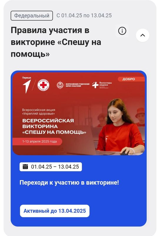 Студенты групп первого курса также приняли участие в онлайн-викторине «Спешу на помощь» от «Движения Первых», которая открыта для участия до 13 апреля и содержит вопросы по оказанию первой помощи. Проверить свои навыки можете и Вы, подав заявку на участие на сайте «Первых» по ссылке: