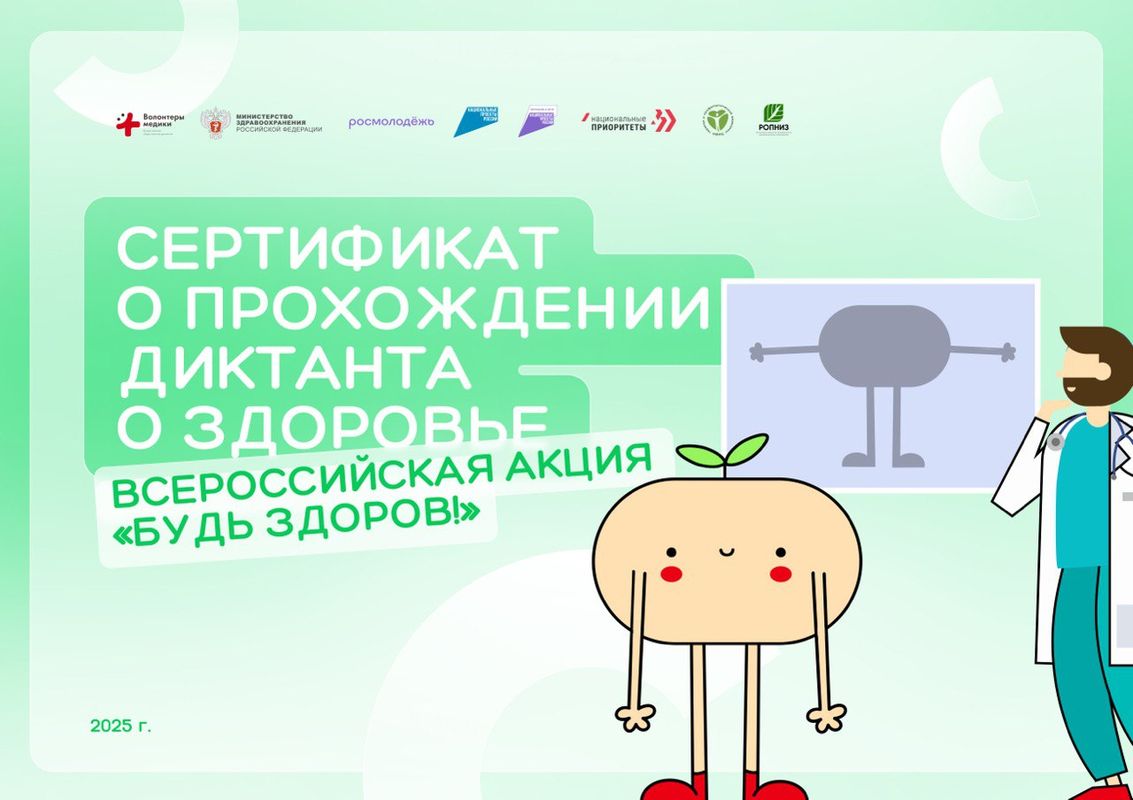 В ходе Диктанта здоровья, который проводится ВОД «Волонтеры-медики» в рамках Всероссийской акции «Будь здоров!», участники узнали полезную информацию о здоровье и принципах здорового образа жизни. Диктант включает в себя вопросы теста и практические задания. Все участники акции получили электронные сертификаты.
