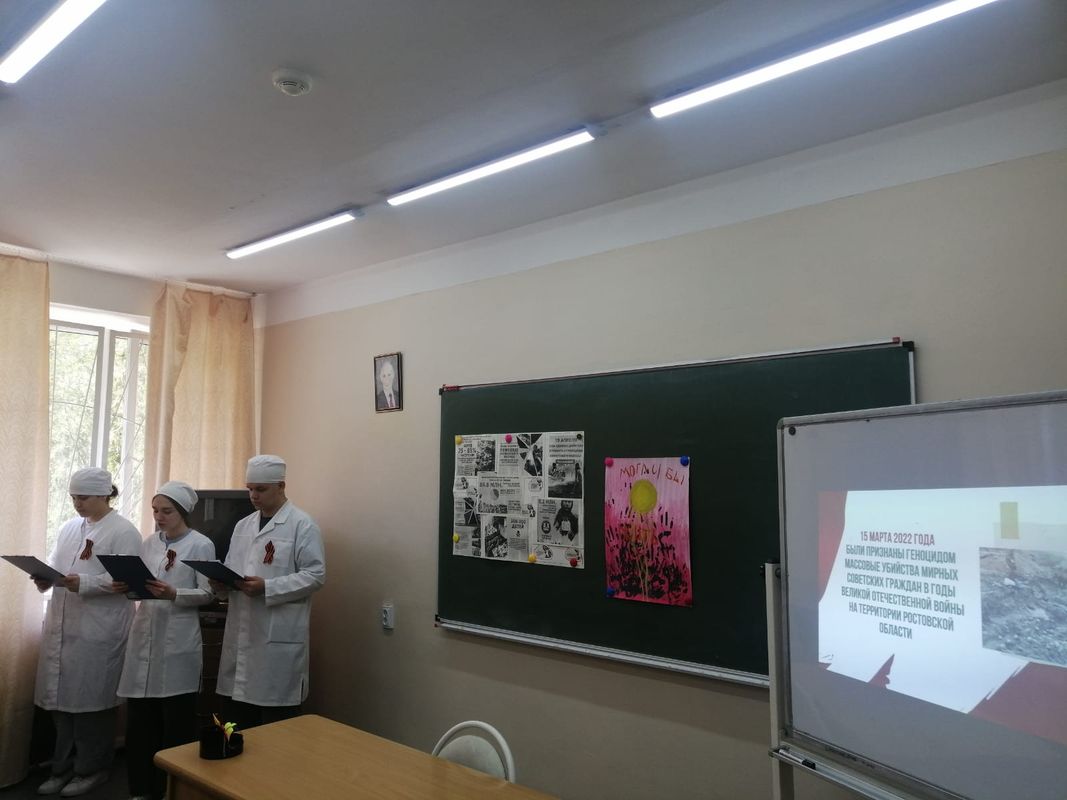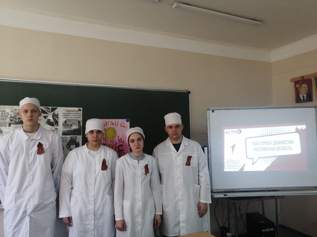 В рамках проекта «Волонтеры: миссия «Победа»» команда ГБПОУ РО «ТМК» «Белые халаты» (Ростовская область) принимает участие в волонтерской практике, цель которой – изучение образовательно-просветительских материалов проекта «Без срока давности» и сохранение исторической памяти о трагедии мирного населения СССР – жертв военных преступлений нацистов в период Великой Отечественной войны.