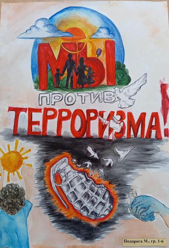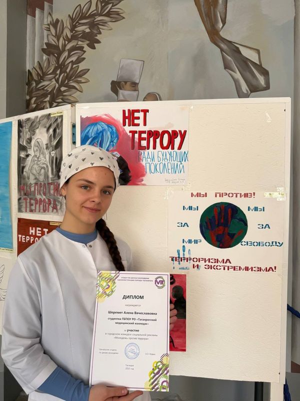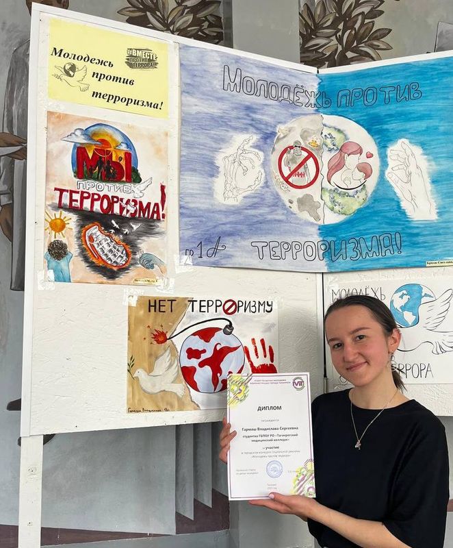 Студенты ГБПОУ РО «ТМК» Бридж Светлана, Ветрова Полина Гармаш Владислава, Губа Елизавета, Куюмчян Кристина, Подорога Марина, Рабочих Анна, Синегубко Ольга и Шеремет Алена приняли участие в городском конкурсе социальной рекламы «Молодежь против террора» представив работы в номинации «Лучший плакат на тему противодействия терроризма и экстремизма».