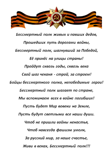 9 мая – День Победы советского народа в Великой Отечественной войне 1941-1945 годов. Этот праздник близок и дорог каждому из нас. В России нет семьи, которую бы не опалила Великая Отечественная война. Память о ней не меркнет. Мы гордимся непокорённым, доблестным поколением победителей и наш долг – хранить и чтить память о тех, кто сокрушил врага.