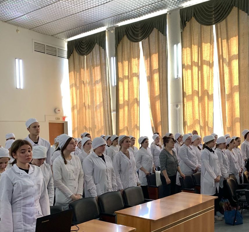 Группа 1 Н специальности «Сестринское дело» под руководством куратора Муравянниковой Ж.Г. подготовила инсценированный тематический час, который включал документальные видеохроники событий военных лет, информацию о героях города Таганрога и инсценировки эпизодов военной жизни.