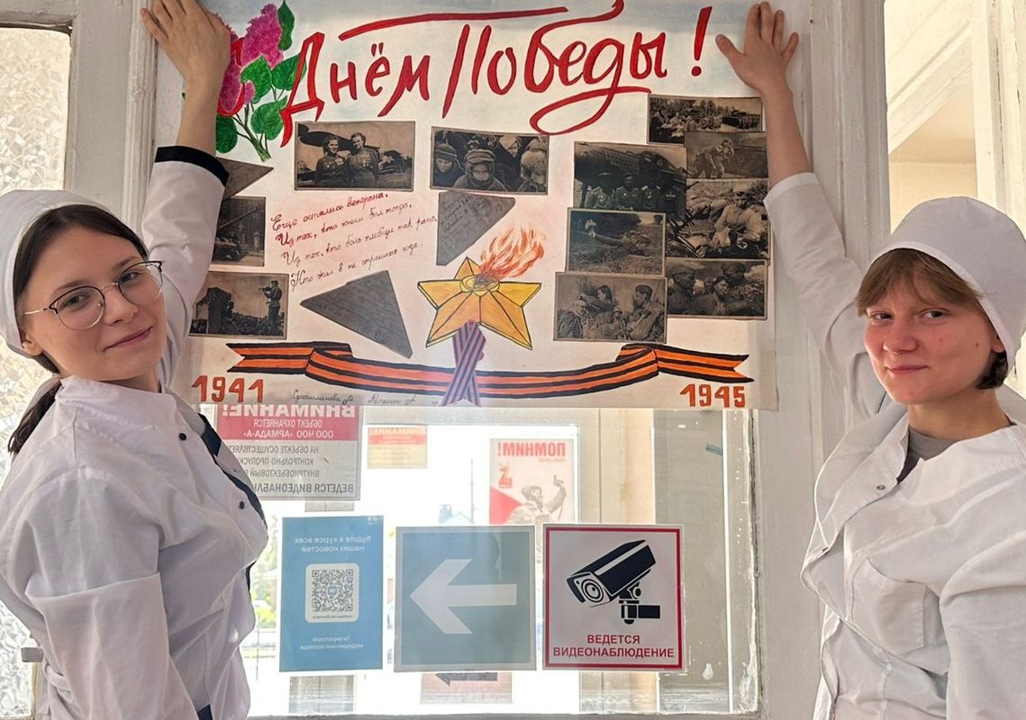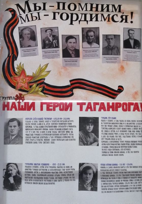 В рамках участия во Всероссийской акции «Окна Победы» в ГБПОУ РО «ТМК» волонтерами оформлены витражи с тематическими информационными плакатами. Информация из семейных архивов собрана студентами колледжа и представлена в формате стенгазет с выдержками фронтовых историй, писем, наградных листов и поздравлений ко Дню Победы.