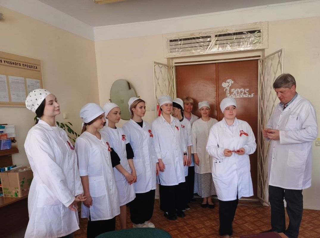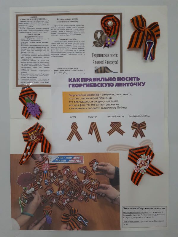 К 80-летию Великой Победы волонтерская группа студентов специальности «Сестринское дело» группы 1-2 организовала акцию «Георгиевская ленточка» и оформила выставку, напомнив, как правильно носить символ воинской славы.
