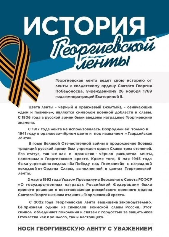 «Георгиевская ленточка» — Всероссийская общественная акция, которая проходит по всей стране с 2005 года. Георгиевская ленточка - символ гордости и воинской славы, великого подвига наших солдат.