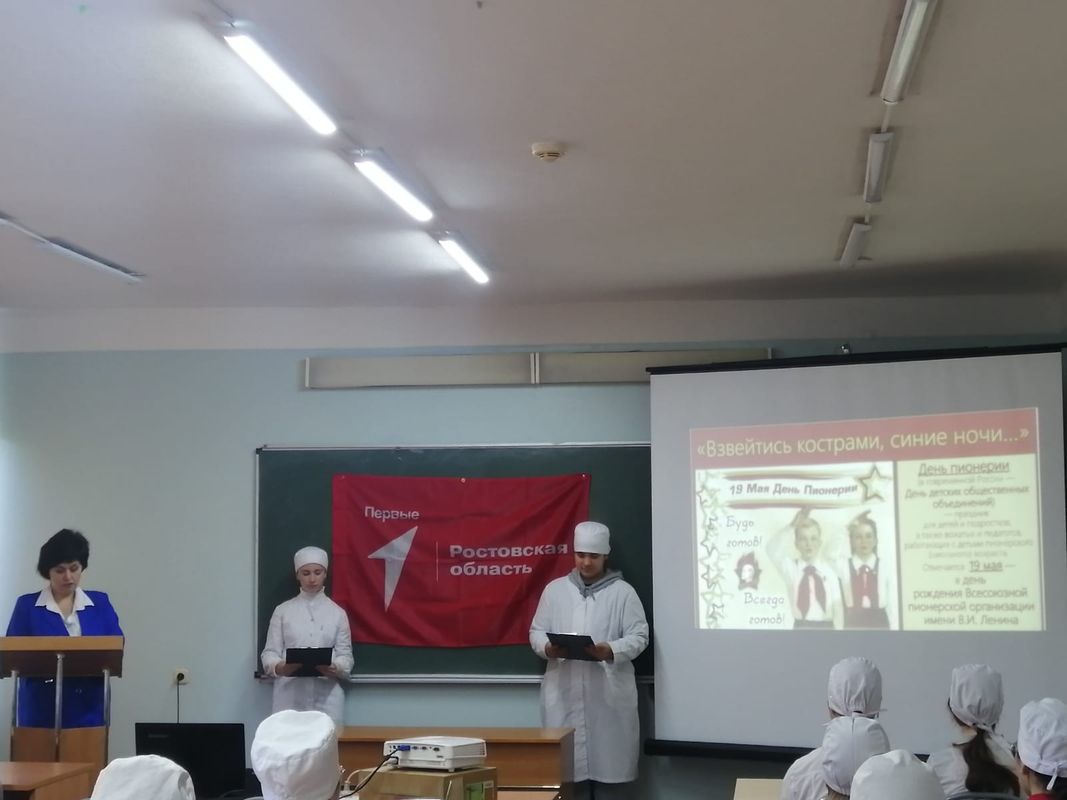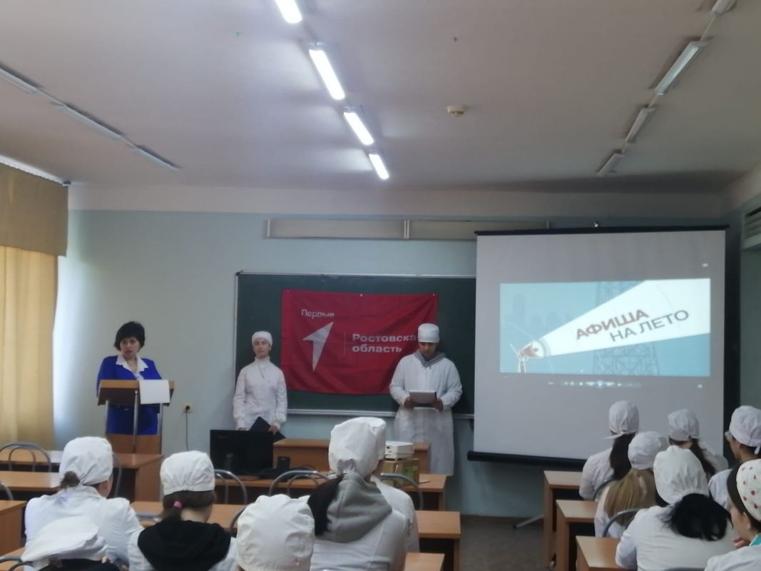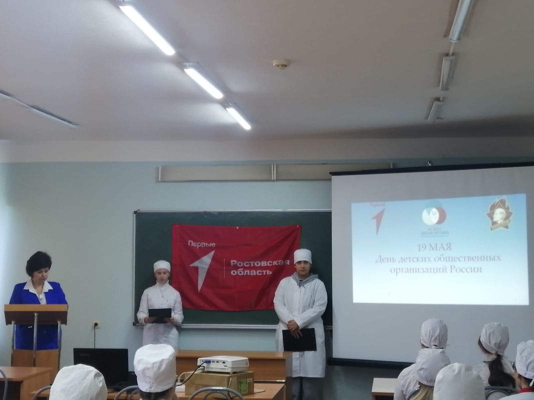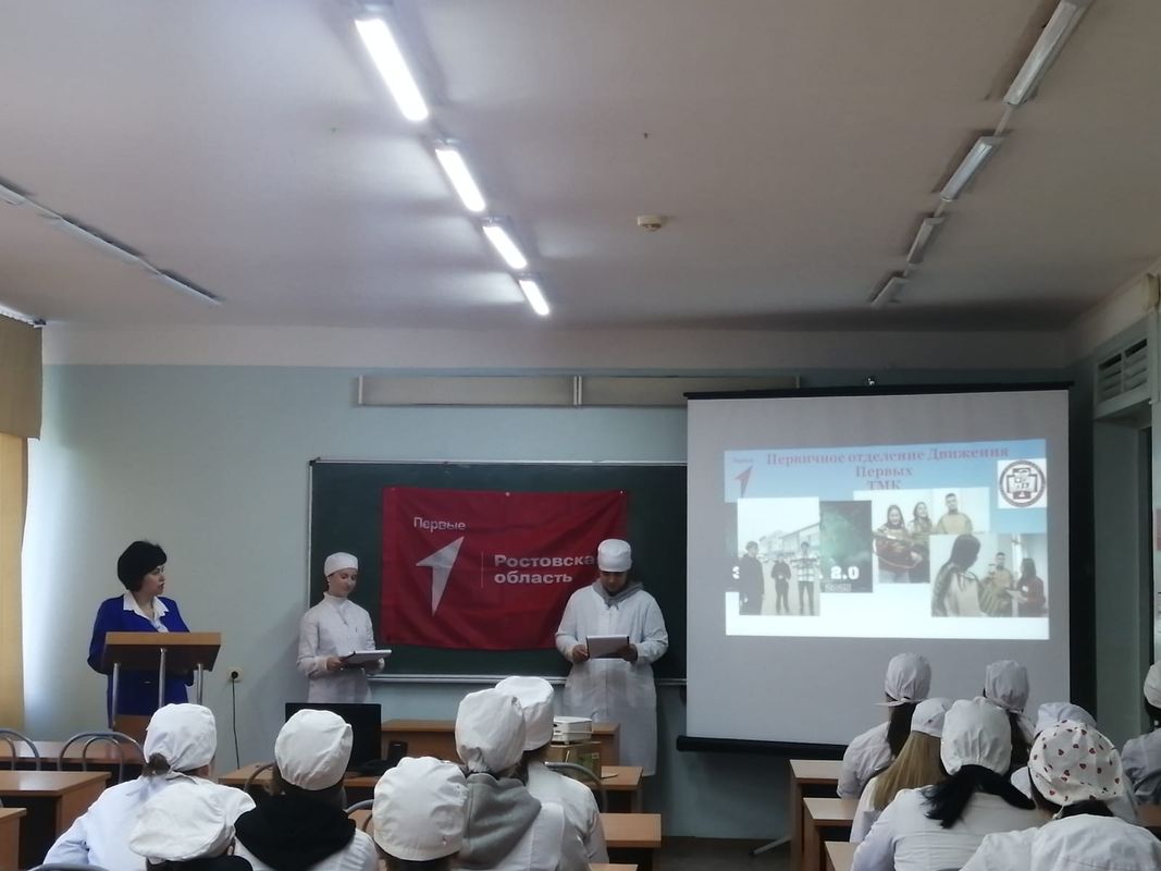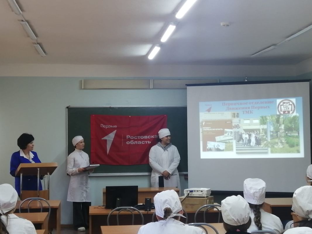 В рамках дня единых действий ко Дню детских общественных организаций России председатель первичного отделения Движения Первых в ГБПОУ РО «ТМК» Арсалан Ю.Г. совместно с советником директора по воспитанию и взаимодействию с детскими общественными объединениями Цыкаловой Т.Ю. и активом студентов – участников Движения Первых провели для студентов первого курса специальности «Сестринское дело» мероприятие «Вместе в будущее», в ходе которого осветили историю возникновения движения, его деятельность и масштабные проекты, а также подготовили отчет о мероприятиях и акциях, в которых студенты колледжа приняли активное участие. Медиасопровождение представлено в формате презентации и видеоролика.