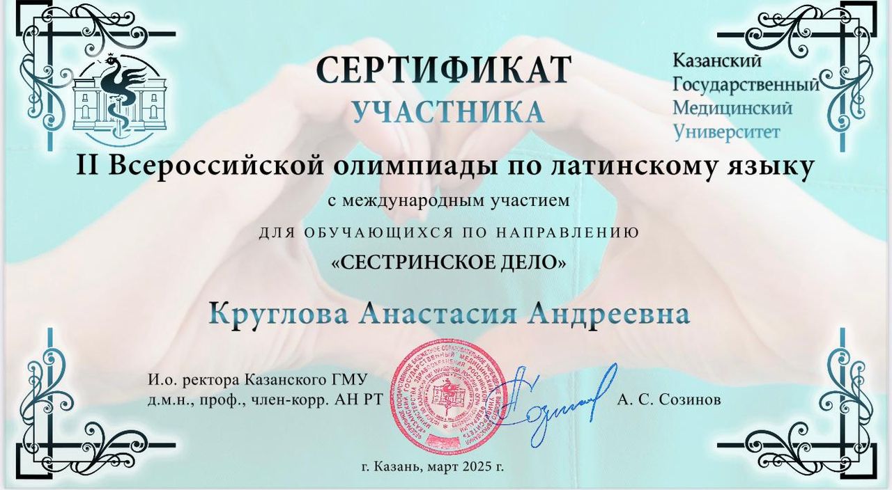 ФГБОУ ВО «Казанский государственный медицинский университет» Министерства здравоохранения Российской Федерации, Факультетом социальной работы и высшего сестринского образования, кафедрой латинского языка и медицинской терминологии с 09.03.2025 по 16.03.2025 проводилась II Всероссийская студенческая олимпиада по латинскому языку для обучающихся по направлению Сестринское дело.