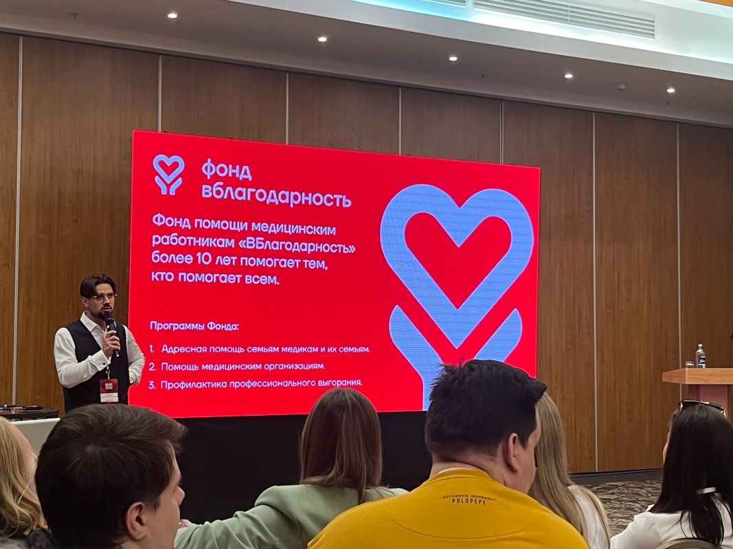 Особое место в этой встрече было отведено фонду «Вблагодарность». Это фонд помощи медицинским работникам, который более 10 лет помогает тем, кто помогает всем. Программа фонда: адресная помощь семьям медиков и их семьям, помощь медицинским организациям, профилактика профессионального выгорания.