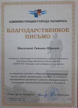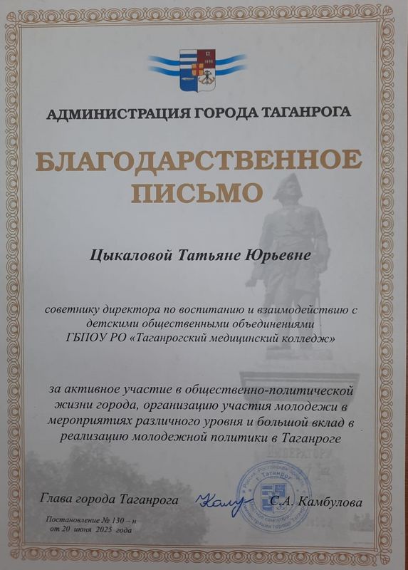 За активное участие в общественно-политической жизни города, организацию участия молодежи в мероприятиях различного уровня и большой вклад в реализацию молодежной политики в г. Таганроге Благодарственным письмом главы Администрации города Таганрога награждена Советник директора по воспитанию и взаимодействию с детскими общественными объединениями ГБПОУ РО «ТМК» Цыкалова Татьяна Юрьевна.
