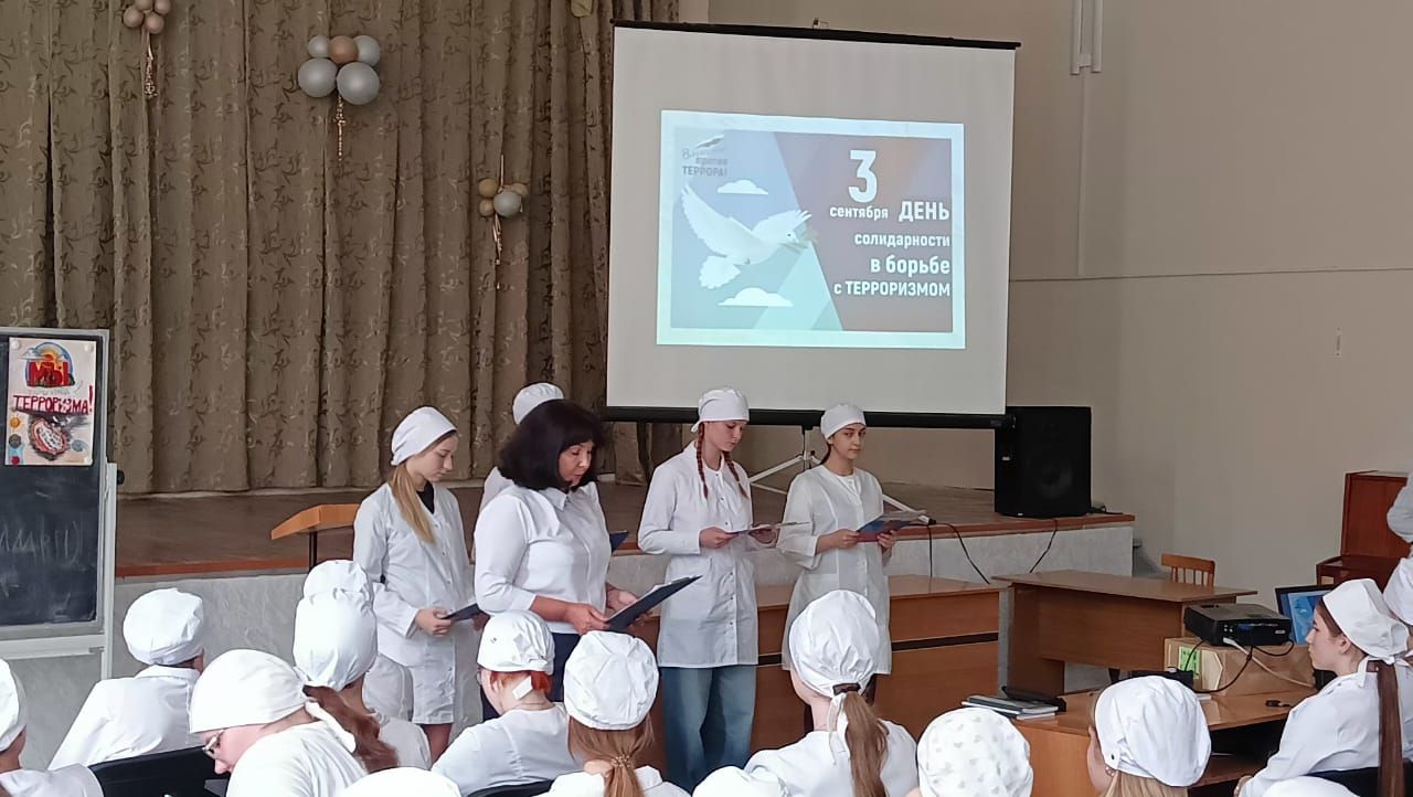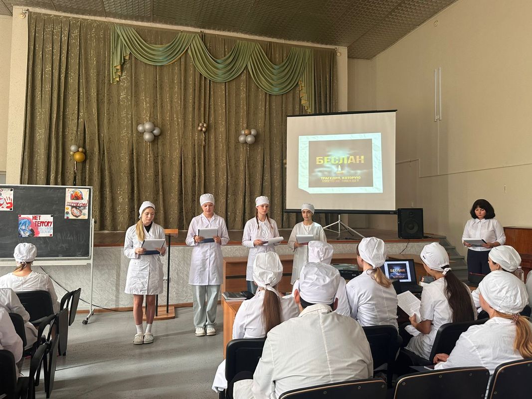 В рамках этой памятной даты в ГБПОУ РО «ТМК» проведен медиа час «Код безопасности» и информационные беседы по обеспечению антитеррористической защиты и предупреждению распространения экстремизма. В ходе воспитательных мероприятий проведена акция Памяти и Минута молчания, организован просмотр видеороликов, рассмотрены юридические аспекты и проведен интерактивный опрос студентов по вопросам безопасности.