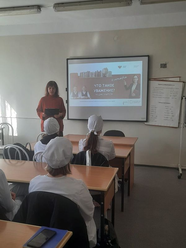 В ходе занятия студенты рассмотрели общечеловеческие ценности взаимоуважение, служение Отечеству и ответственность за его судьбу, просмотрели тематические видеоролики. В итоге был сделан вывод о том, что учитель играет важную роль в формировании личности и жизненных ценностей наряду с семьей, а путь во взрослую жизнь связан с ответственностью за свои поступки и с соблюдением принятых общественных норм.