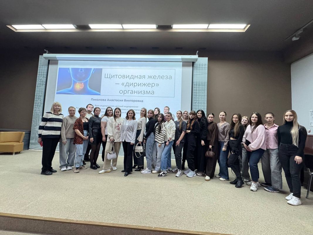 17 октября 2025 года в рамках проведения профориентационной и воспитательной работы студенты специальности Акушерское дело 1 курса группы Г: Колесникова К., Корниенко А., Кравченко Е., Лузанова А., Пискунова Т., Селюкова А., Семко В., Серебрякова А., Терещенко Л., Торопова В. и Щеглов М., под руководством преподавателя колледжа и руководителя Акушерского кружка Божковой Юлии Александровны и студенты специальности Лечебное дело, под руководством преподавателя Маслоченко Наталии Юрьевны посетили увлекательное занятие в клубе долголетия, посвященное щитовидной железе.