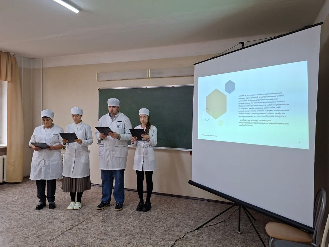 В рамках дня единых действий студенты группы 3А специальности Лечебное дело Рябинская А., Скрынникова М., Пузанова Т., Потапенко Е. и Аксененко Г. под руководством куратора Хорошавиной Л.В. провели поточное воспитательное мероприятие «Формула добра», посвященное Международному дню инвалидов. Участники мероприятия прослушали информационный материал в сопровождении подготовленной студентами презентации, обсудили ключевые темы мероприятия, связанные с общечеловеческими ценностями.