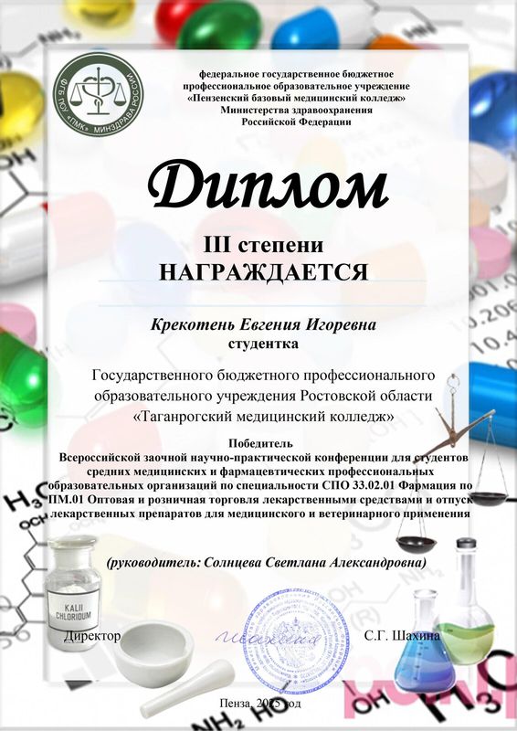 В соответствии с учебным планом работы Совета директоров СМФОО ПФО на 2025-2026 учебный год была проведена Всероссийская заочная научно-практическая конференция для студентов средних медицинских и фармацевтических профессиональных образовательных организаций по специальности 33.02.01 Фармация по ПМ.01 «Оптовая и розничная торговля лекарственными средствами и отпуск лекарственных препаратов для медицинского и ветеринарного применения». Конференцию организовал ФГБПОУ «Пензенский базовый медицинский колледж» Министерства здравоохранения Российской Федерации с целью выявления талантливых и творчески активных студентов. Основными задачами конференции являются:
