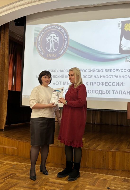 6 февраля 2026 года в Таганрогском институте управления и экономики состоялась торжественная церемония награждения победителей Международного российско-белорусского межвузовского конкурса эссе на иностранном языке «От мечты – к профессии: конкурс эссе для молодых талантов», организованного по инициативе кафедры гуманитарных дисциплин Таганрогского института управления и экономики совместно с кафедрой профессиональной иноязычной подготовки Барановичского государственного университета (Республика Беларусь).
