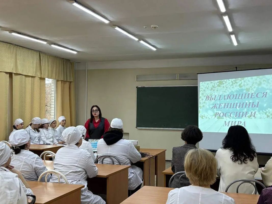 В рамках реализации дня единых действий в ГБПОУ РО «ТМК» в группах первого курса специальности Фармация проведено поточное собрание на тему «Выдающиеся женщины России и мира» с использованием материалов лекции Российского общества «Знание» - «Всегда первые: как женщины России изменили историю».
